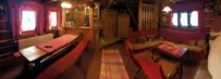 Veľká spoločenská miestnosť 6x6 metrov s krbom, kuchynským kútom s vybavením, špajza, mikrovlnka, chladnička s mrazničkou, rýchlo varná kanvica, umývačka riadu, TV- DVD, SAT. Kúpeľňa so sprchovacím kútom a WC, 1 x samostatné WC. Na prízemí sa nachádza aj jedna 2-lôžková izba.